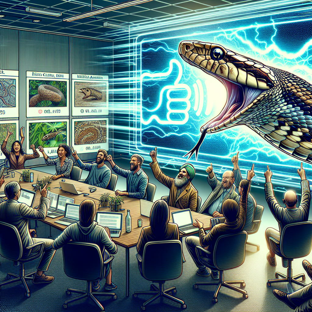 ChatGPT: Prompt: Create an image reflecting the scene in which a group of zoologists in Alabama passionately discuss their latest research on local wildlife in a cyber data art style. The room is filled with an electric atmosphere as the researchers exchange observations and findings. Meanwhile, on a computer screen, a captivating Deep Look YouTube video showcasing the intricate details of a snake's scales is gaining numerous likes, symbolizing the growing appreciation for wildlife ignited by the zoologists' dedication. The image should exude a sense of digital wave and fusion of enthusiasm for wildlife with rising viewers' appreciation, capturing the essence of wildlife love in a visually striking manner.