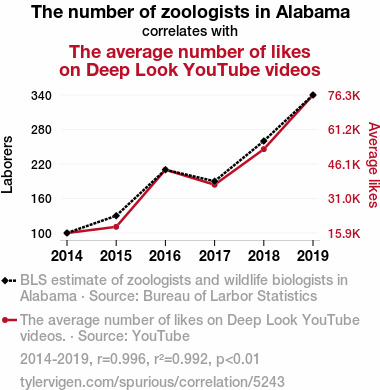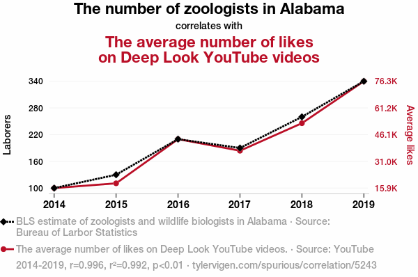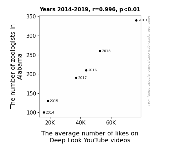 This means 99.2% of the change in the one variable (i.e., The average number of likes on Deep Look YouTube videos) is predictable based on the change in the other (i.e., The number of zoologists in Alabama) over the 6 years from 2014 through 2019.
