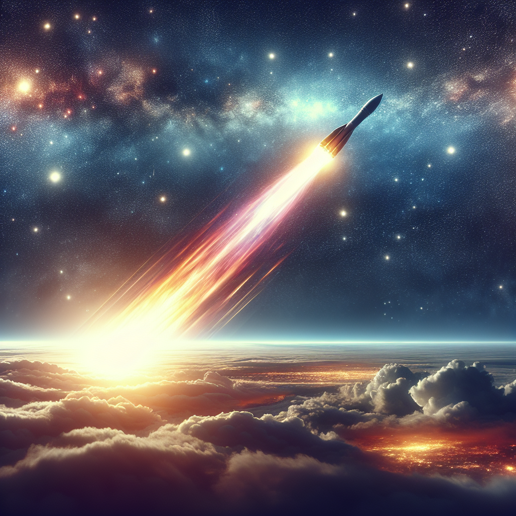 Prompt: Prompt: Create an image of a futuristic scene with a starry night sky as the backdrop. A brightly gleaming SciShow Space YouTube channel's video titles are prominently displayed in the sky, exuding cosmic inspiration. Overlapping with the sky, a stream of brilliant jet fuel blazes behind a rocket as it ascends into the atmosphere, symbolizing the extraordinary inventiveness propelling their stellar content. The depiction should include only scenes, people, and objects, it should not include text or speech bubbles.