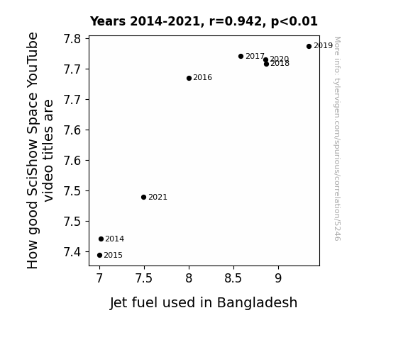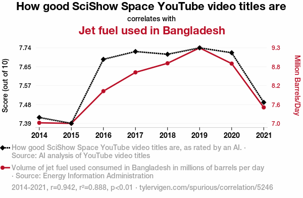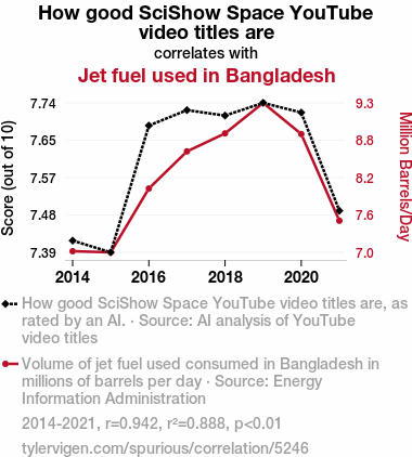 This means 88.8% of the change in the one variable (i.e., Jet fuel used in Bangladesh) is predictable based on the change in the other (i.e., How good SciShow Space YouTube video titles are) over the 8 years from 2014 through 2021.