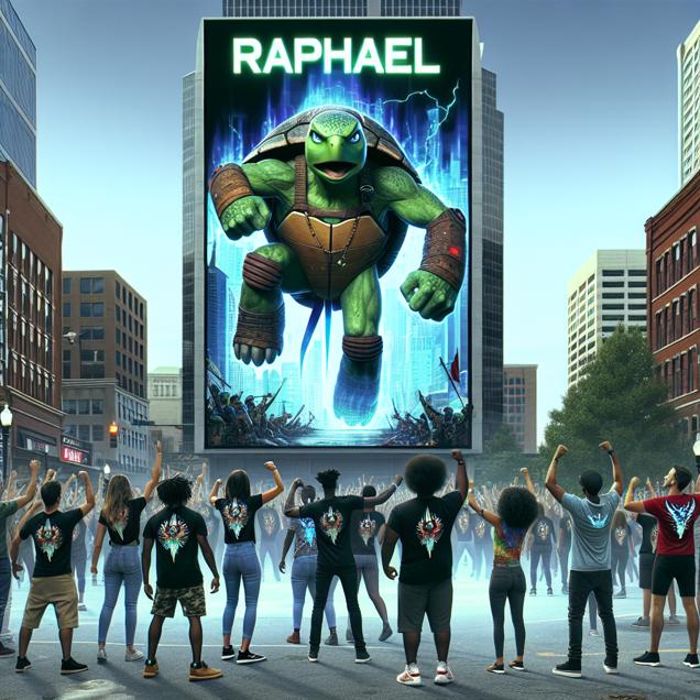 ChatGPT: Generate an image of a futuristic North Carolina town square where a towering holographic billboard prominently displays the name "Raphael" in bold, glowing letters alongside an imposing image of the determined ninja turtle. A diverse group of passionate individuals, all wearing striking "Vote Libertarian" t-shirts, are gathered around the billboard, their actions and expressions exuding a palpable energy and sense of purpose. The scene should capture the fervor of their shared belief in individual liberty, augmenting the visual with hints of advanced technology and a sense of radical change on the horizon.