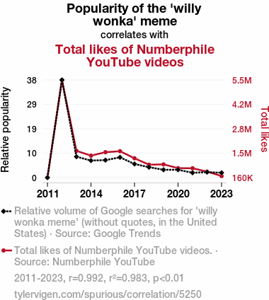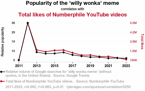 - The spurious research paper: The Golden Ticket: Exploring the Sweet Relationship Between 'Willy Wonka' Popularity and Numberphile YouTube Likes