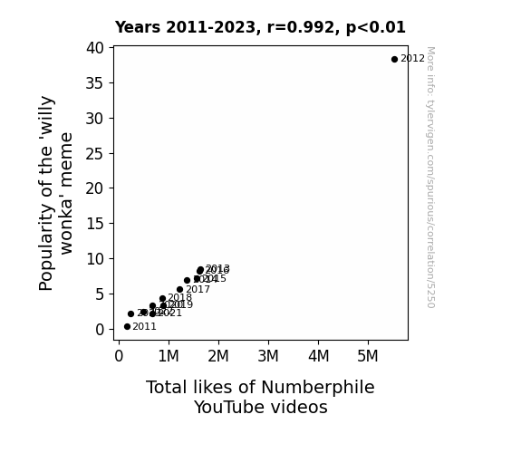 This means 98.3% of the change in the one variable (i.e., Total likes of Numberphile YouTube videos) is predictable based on the change in the other (i.e., Popularity of the 'willy wonka' meme) over the 13 years from 2011 through 2023.