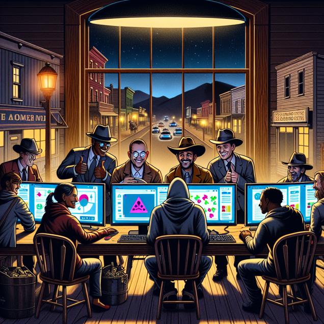 ChatGPT: Generate an image of a small town in Wyoming, with a group of mathematically inclined criminals gathered around a computer in a dimly lit room. Show the criminals laughing uproariously as they watch Matt Parker's YouTube videos, with their facial expressions conveying a mix of enjoyment and mischievous intent. The computer screen should be visually striking, displaying the stand-up math content that has captivated the criminals. The room should have a slightly shadowy, clandestine atmosphere, hinting at the upcoming comedic bank heist while the criminals are engrossed in the online comedy. Capture the essence of the moment as the criminals enthusiastically click the "like" button, illustrating their diversion into the world of stand-up math amidst their criminal activities.