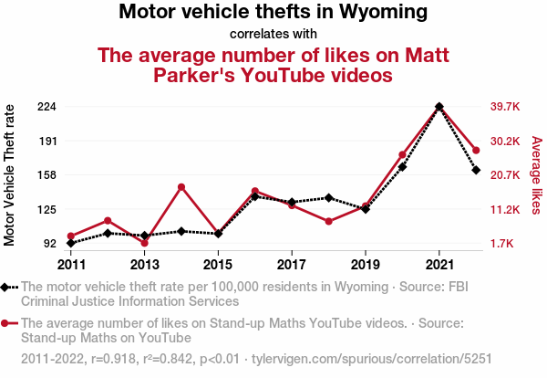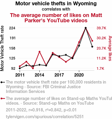 - The spurious research paper: Driven to Like: The Car-tographic Connection Between Motor Vehicle Thefts in Wyoming and the Stand-up Maths YouTube Likes