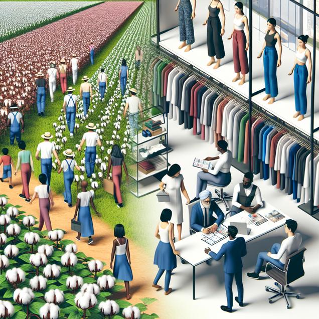 Prompt: Prompt: Generate an image in the style of cutsy graphics portraying workers in a genetically modified cotton field alongside a bustling store front featuring trendy clothing made from the surplus of cotton. Show a sleek office with people brainstorming video titles inspired by the fashionable cotton-based clothing in the market. The depiction should include only scenes, people, and objects, it should not include text or speech bubbles.