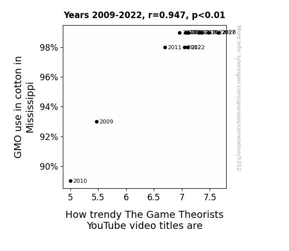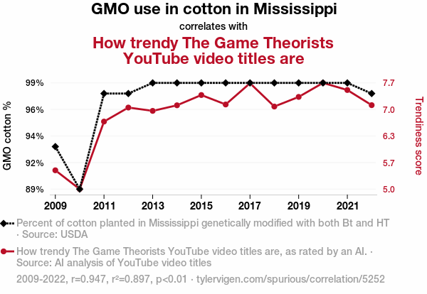 This means 89.7% of the change in the one variable (i.e., How trendy The Game Theorists YouTube video titles are) is predictable based on the change in the other (i.e., GMO use in cotton in Mississippi) over the 14 years from 2009 through 2022.