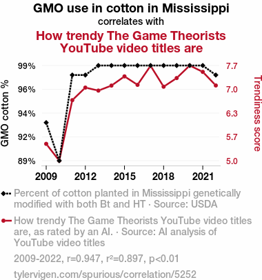 The unprecedented correlation uncovered between genetically modified organism (GMO) cotton cultivation in Mississippi and the trendiness of The Game Theorists' YouTube video titles has left researchers both intrigued and bemused. This unexpected association challenges conventional wisdom, akin to discovering an Easter egg in a game that leads to a surprising revelation.