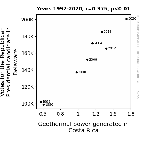 This means 95% of the change in the one variable (i.e., Geothermal power generated in Costa Rica) is predictable based on the change in the other (i.e., Votes for the Republican Presidential candidate in Delaware) over the 8 years from 1992 through 2020.