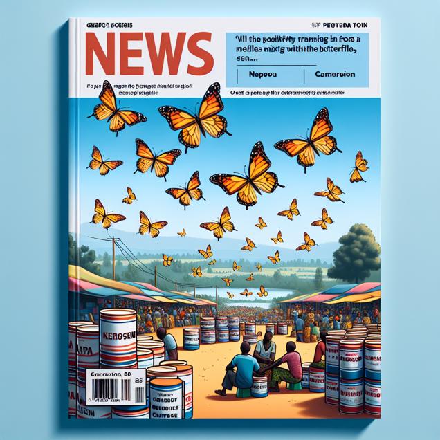 Prompt: Generate an image of a TIME magazine cover showing a vibrant Napa landscape with clear blue skies and a sense of fresh air. Include colorful butterflies fluttering from Napa to Cameroon, symbolizing the transfer of positivity. In Cameroon, depict a local market scene with kerosene-based products and a hint of the positive vibes blending in with the local economic activities. The depiction should include only scenes, people, and objects, it should not include text or speech bubbles.