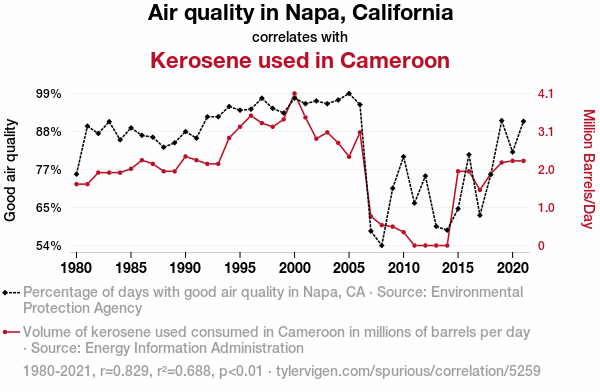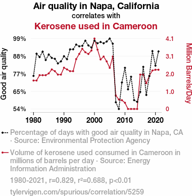 This means 68.8% of the change in the one variable (i.e., Kerosene used in Cameroon) is predictable based on the change in the other (i.e., Air quality in Napa, California) over the 42 years from 1980 through 2021.