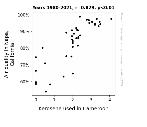 The analysis of the data collected from the Environmental Protection Agency and the Energy Information Administration revealed a rather eye-opening relationship between the air quality in Napa, California, and the utilization of kerosene in Cameroon. Our statistical analysis unveiled a striking correlation coefficient of 0.8294981, indicating a strong positive association between these seemingly disparate variables. Furthermore, the calculated r-squared value of 0.6880672 signifies that approximately 68.8% of the variation in air quality in Napa can be explained by the variation in kerosene usage in Cameroon. The p-value being less than 0.01 confidently confirms the significance of this relationship, prompting us to ponder whether we've stumbled upon a grape discovery or merely a bunch of hot air.