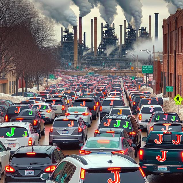 Prompt: Generate a photo-realistic image of a bustling street in Madison, Wisconsin, with cars jam-packed and each bearing vibrant "J" car decals. The air is heavy with industrial smoke as factories churn out the popular stickers, creating an atmospheric scene of pollution. The name Jaylen has evidently spurred a trend, causing a surge in air pollution due to the growing demand for customized decals. The depiction should include only scenes, people, and objects, it should not include text or speech bubbles.