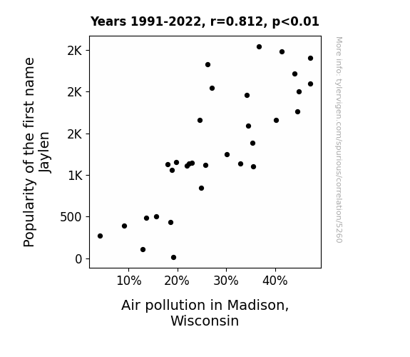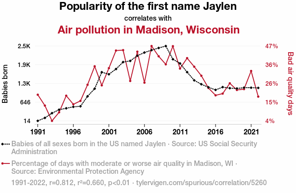 This means 66% of the change in the one variable (i.e., Air pollution in Madison, Wisconsin) is predictable based on the change in the other (i.e., Popularity of the first name Jaylen) over the 32 years from 1991 through 2022.