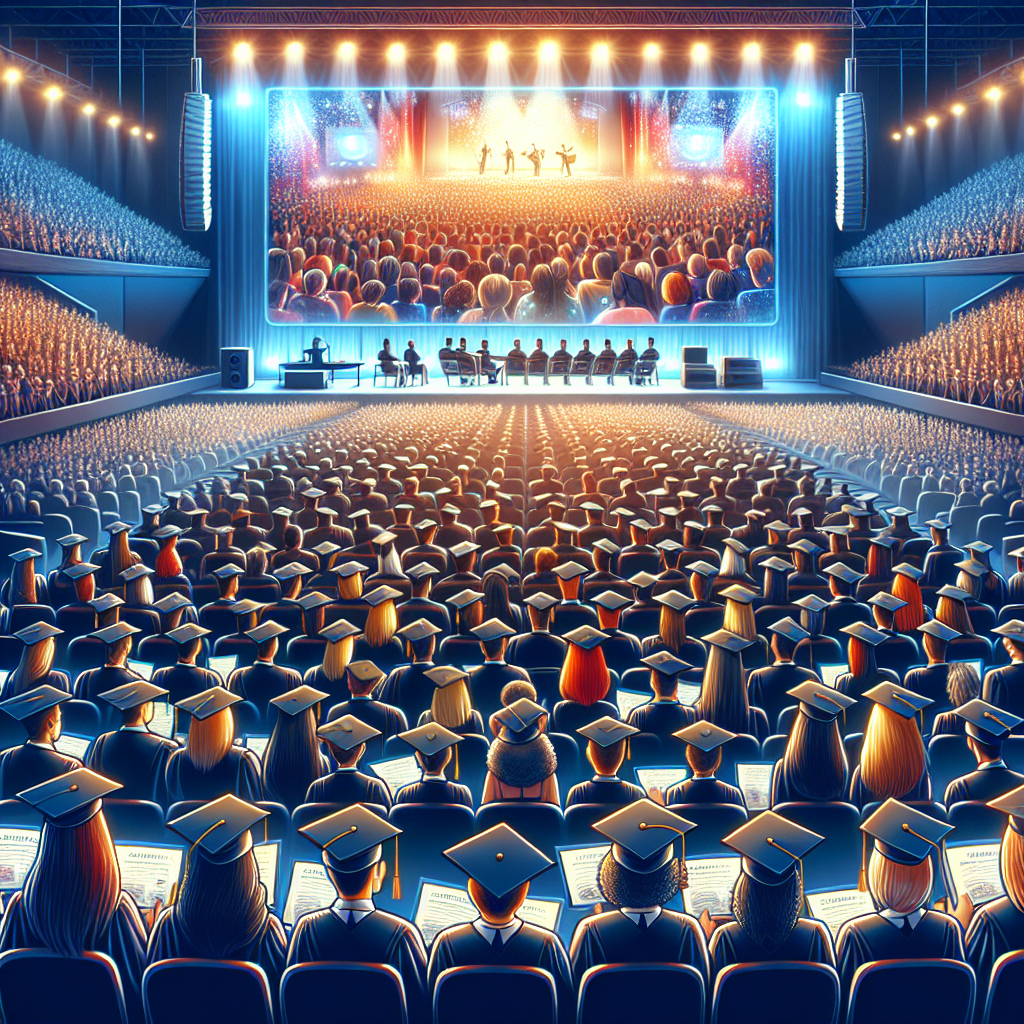 Prompt: Generate a photo-realistic image of a lively auditorium filled with graduates proudly displaying their Associate degrees in Music and Dance. In the background, showcase a large screen displaying the soaring views of MrBeast's latest YouTube video. The audience should be depicted as appreciating the philanthropic content, with their musical and dance appreciation amplifying their enjoyment of the video. The depiction should include only scenes, people, and objects, it should not include text or speech bubbles.