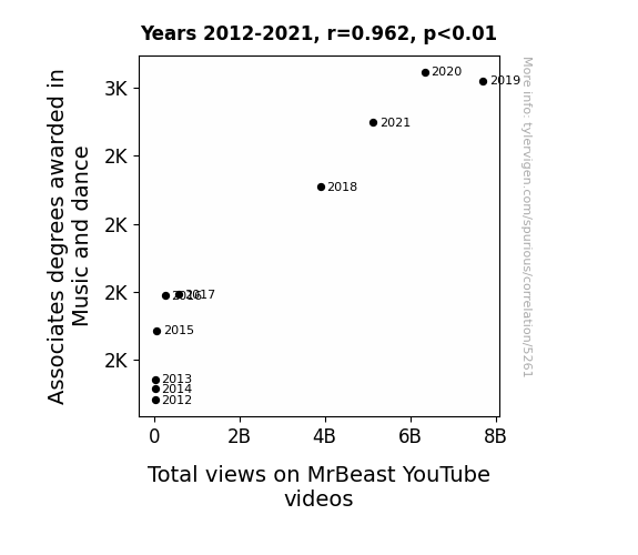 In this paper, we set out to explore a rather enigmatic connection: the relationship between the number of Associates degrees awarded in Music and dance and the total views on MrBeast YouTube videos. While the topic may seem like a *stretch*, our research has uncovered some intriguing findings. Leveraging data from the National Center for Education Statistics and YouTube, we crunched numbers and uncovered a correlation coefficient of 0.9624621 and a p-value less than 0.01 for the years 2012 to 2021.