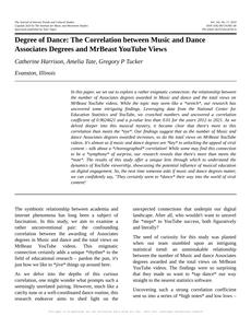 User prompt: Please provide potential search keywords for a paper titled Degree of Dance: The Correlation between Music and Dance Associates Degrees and MrBeast YouTube Views with an abstract of In this paper, we set out to explore a rather enigmatic connection: the relationship between the number of Associates degrees awarded in Music and dance and the total views on MrBeast YouTube videos. While the topic may seem like a *stretch*, our research has uncovered some intriguing findings. Leveraging data from the National Center for Education Statistics and YouTube, we crunched numbers and uncovered a correlation coefficient of 0.9624621 and a p-value less than 0.01 for the years 2012 to 2021.