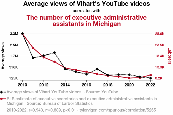 ChatGPT: The view count bar graph for Vihart's YouTube videos declined sharply, mirroring the fall in demand for geometric and mathematical concepts. In Michigan, a line graph showed a steep drop in the number of executive administrative assistants, reflecting the reduced need for "parallelogram management" and "cosine coordination". Both graphs converged, indicating a direct correlation between the reduction in views and the decreasing demand for executive administrative assistants in Michigan.