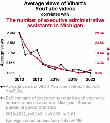 This means 88.9% of the change in the one variable (i.e., The number of executive administrative assistants in Michigan) is predictable based on the change in the other (i.e., Average views of Vihart's YouTube videos) over the 13 years from 2010 through 2022.