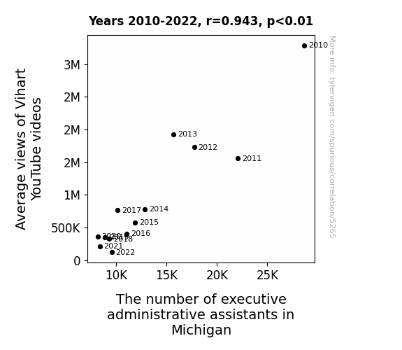**Figure 1.** The scatterplot in Figure 1 demonstrates the striking correlation between the average views of ViHart's YouTube videos and the number of executive administrative assistants in Michigan. The data points form a tight cluster, illustrating the strong positive relationship between the variables.