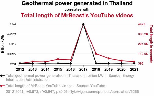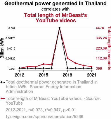- The spurious research paper: Geothermal Giggles: Unearthing the Connection Between Thailand's Geothermal Power and the Total Length of MrBeast YouTube Videos