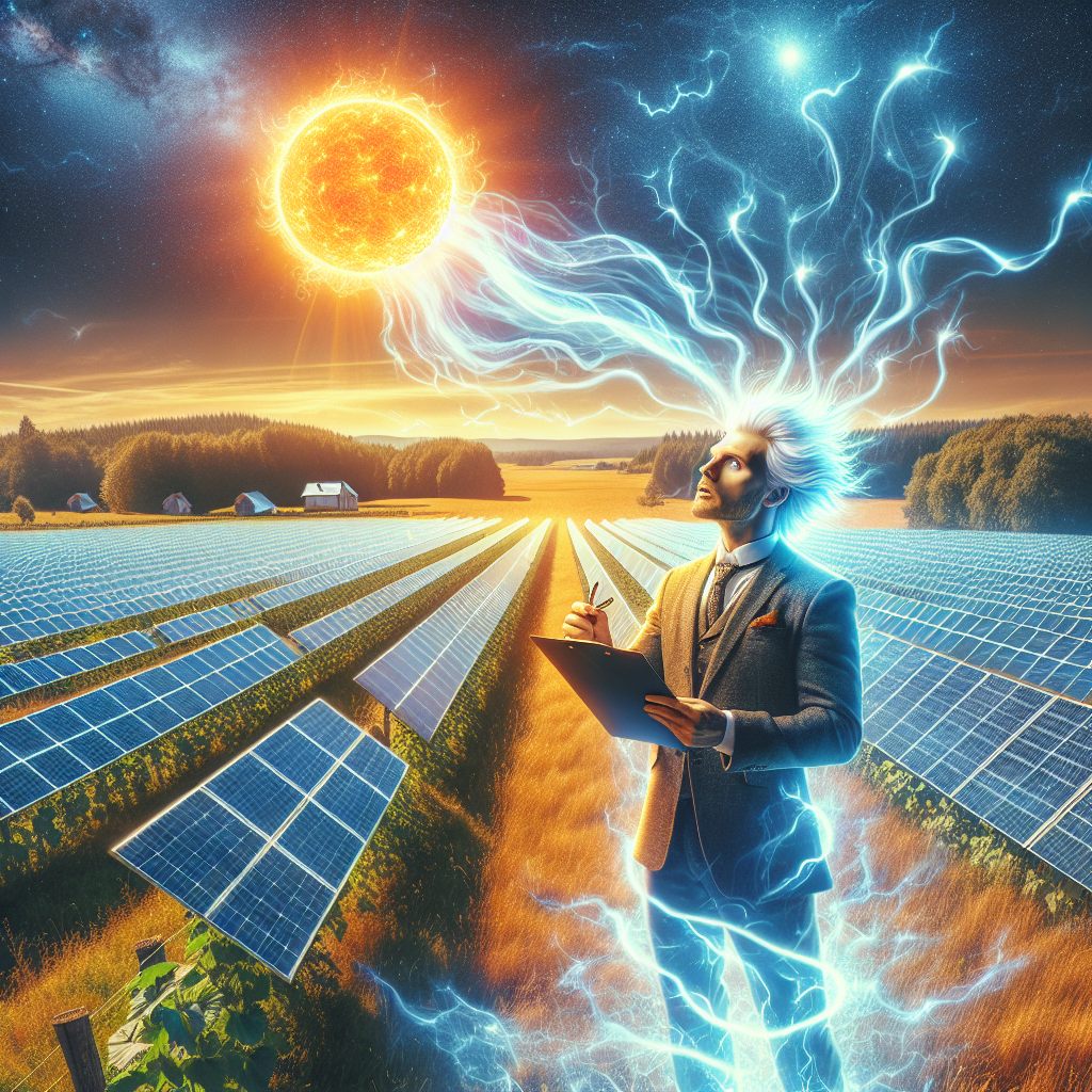 Prompt: Generate an image of a cyber folk scene featuring science communicator Steve Mould. Show him standing in a field of glowing solar panels in the Estonian countryside, smiling as he holds a clipboard labeled "Average views of Steve Mould's YouTube videos." The bright orange sun in the sky looks energized, and small speech bubbles with science symbols are floating from the videos to the panels, infusing them with extra brightness. The sunlight itself looks charged up and illuminated, as if it had just received a boost of knowledge and inspiration. The depiction should include only scenes, people, and objects, it should not include text or speech bubbles.