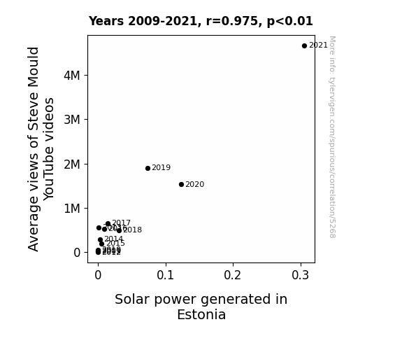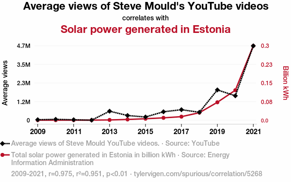 This means 95.1% of the change in the one variable (i.e., Solar power generated in Estonia) is predictable based on the change in the other (i.e., Average views of Steve Mould's YouTube videos) over the 13 years from 2009 through 2021.