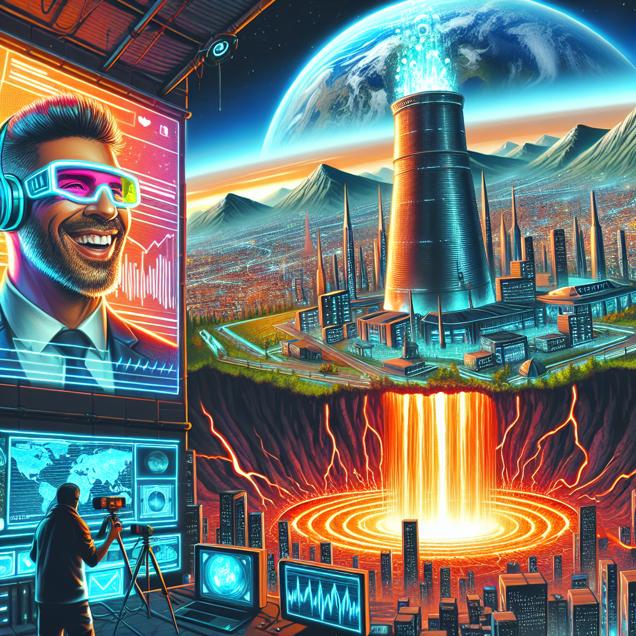 ChatGPT: Prompt: Generate an image of a cyberpunk Italy where a sleek geothermal power plant stands amidst a vibrant cityscape. Deep underground, visualize the Earth's core as a pulsating, luminescent energy source. In the foreground, depict a YouTuber with a playful smile filming a video in a futuristic studio, surrounded by advanced technology. Show the contrast between the calm exterior and the underlying seismic activity.
