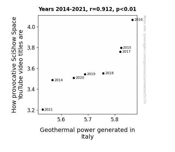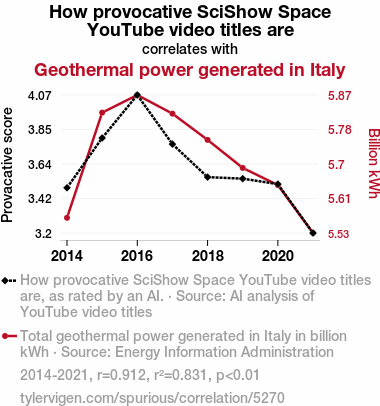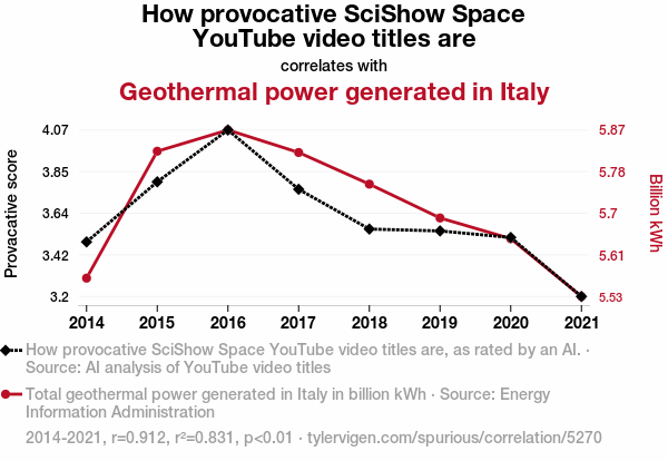 This means 83.1% of the change in the one variable (i.e., Geothermal power generated in Italy) is predictable based on the change in the other (i.e., How provocative SciShow Space YouTube video titles are) over the 8 years from 2014 through 2021.