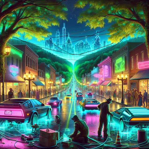 User prompt: Please respond with an image generation prompt that would be likely to create an interesting visual using DALLE-3, using the following style: [ Cyber folk ] and depicting this scene: In Sevierville, Tennessee, the sky is clear and the air is fresh, with lush green trees lining the roads. A line of cars from various manufacturers can be seen gathered in the town. There's a noticeable increase in electrical sparks and energy flowing around the cars. Mechanics and engineers are scrambling to address the surge in electrical system issues, while residents enjoy the benefits of cleaner and more conductive air that has unexpectedly left the automakers revved up. Keep the visual depiction simple. Do not include any words or speech bubbles.