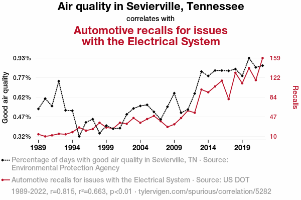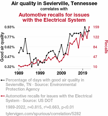 This means 66.3% of the change in the one variable (i.e., Automotive recalls for issues with the Electrical System) is predictable based on the change in the other (i.e., Air quality in Sevierville, Tennessee) over the 34 years from 1989 through 2022.