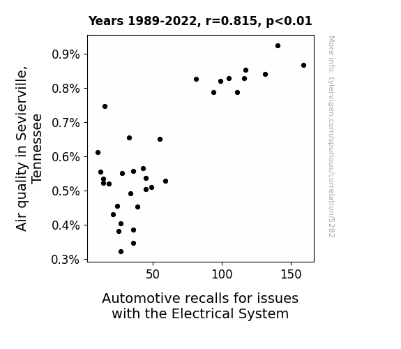 The p-value of less than 0.01 indicates that this correlation is highly significant, leaving little room for doubt that there is indeed an electrifying connection between air quality in Sevierville and automotive recalls for electrical system issues.