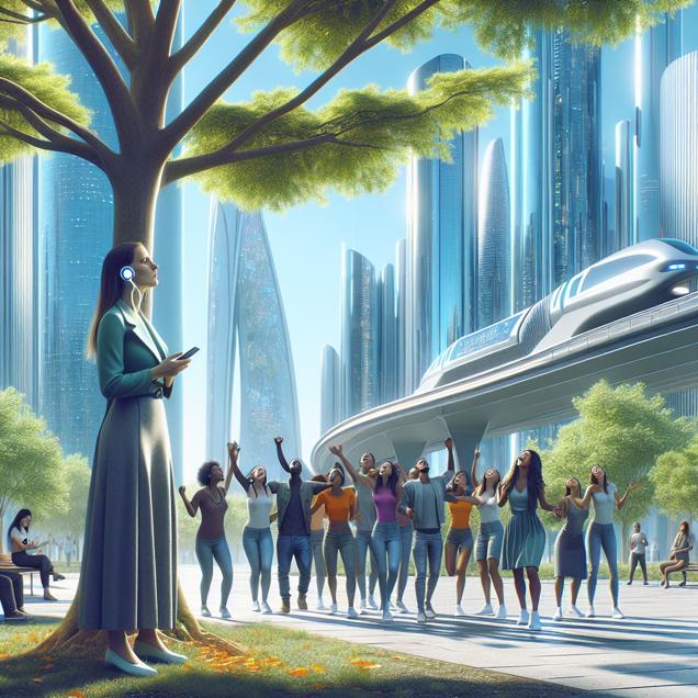 User prompt: Please respond with an image generation prompt that would be likely to create an interesting visual using DALLE-3, using the following style: [ Futuristic ] and depicting this scene: In a park in Hartford, Connecticut, a group of friends gathered. Jenny, whose popularity had declined, stood under a tree, surrounded by fewer people singing "867-5309/Jenny" by Tommy Tutone. The decrease in outdoor gatherings led to fewer cars on the road, reducing air pollution in the city. The clear blue skies above the park hinted at the connections between Jenny's popularity and the cleaner air, as the sounds of harmonizing voices were no longer as prevalent. Keep the visual depiction simple. Do not include any words or speech bubbles.