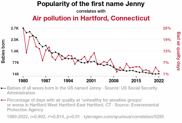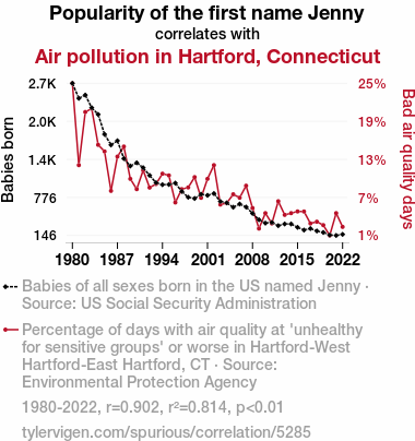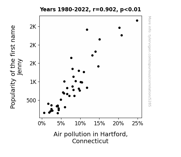 "Jenny" popularity, air pollution correlation, Hartford, Connecticut, US Social Security Administration data, Environmental Protection Agency data, correlation coefficient, atmospheric quality, name "Jenny" and air pollution, statistical analysis, environmental factors
