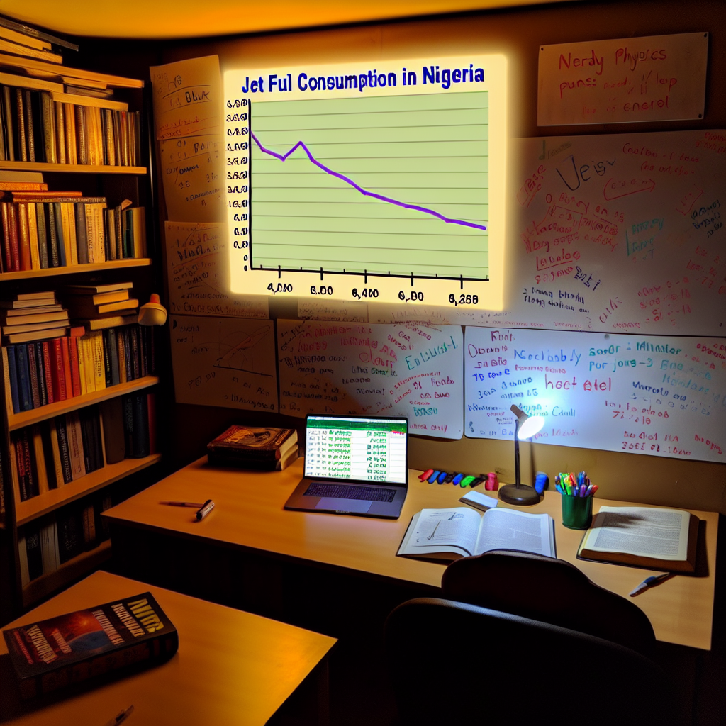 User prompt: Please describe a visual scene that prominently depicts both How nerdy minutephysics YouTube video titles are and Jet fuel used in Nigeria, in the following situation: As the availability of jet fuel in Nigeria decreases, there is a corresponding decrease in the number of nerdy science puns fueling the creativity of minutephysics video titles. It's a case of less fuel leading to less quirk in physics quirks!. Keep the description simple.