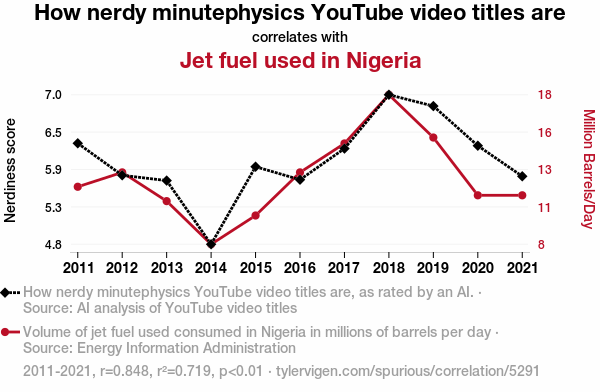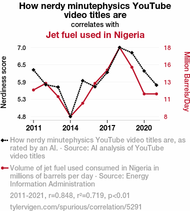 - The spurious research paper: Jet Fuel, Physics Feuds, and Nerdy Moods: Analyzing the Relationship Between minutephysics YouTube Video Titles and Jet Fuel Consumption in Nigeria