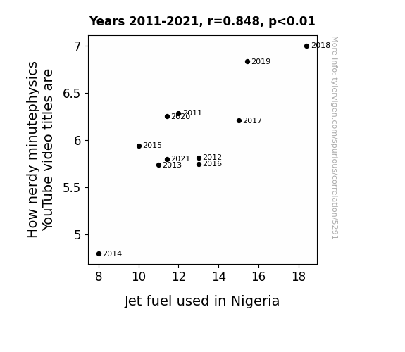 This means 71.9% of the change in the one variable (i.e., Jet fuel used in Nigeria) is predictable based on the change in the other (i.e., How nerdy minutephysics YouTube video titles are) over the 11 years from 2011 through 2021.