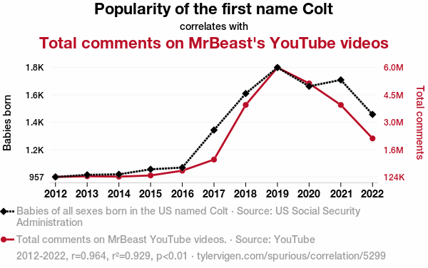 A linear line chart with years as the X-axis and two variables on the Y-axis. The first variable is Popularity of the first name Colt and the second variable is Total comments on MrBeast's YouTube videos.  The chart goes from 2012 to 2022, and the two variables track closely in value over that time. Small Image