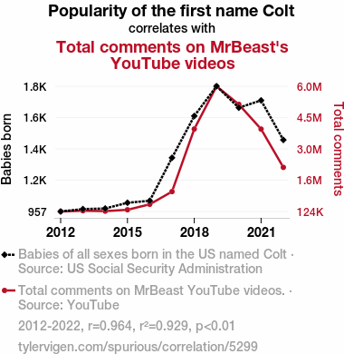 This means 92.9% of the change in the one variable (i.e., Total comments on MrBeast's YouTube videos) is predictable based on the change in the other (i.e., Popularity of the first name Colt) over the 11 years from 2012 through 2022.
