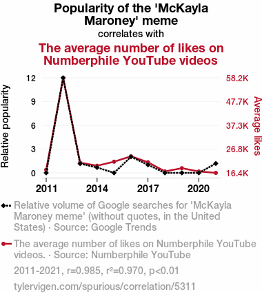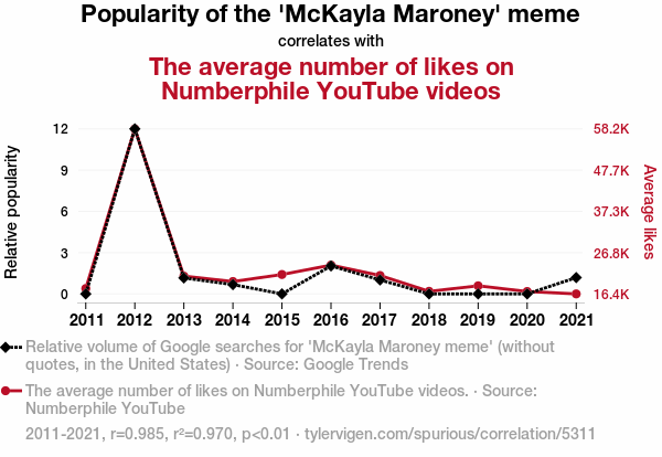 A linear line chart with years as the X-axis and two variables on the Y-axis. The first variable is Popularity of the 'McKayla Maroney' meme and the second variable is The average number of likes on Numberphile YouTube videos.  The chart goes from 2011 to 2021, and the two variables track closely in value over that time. Small Image