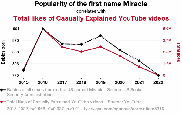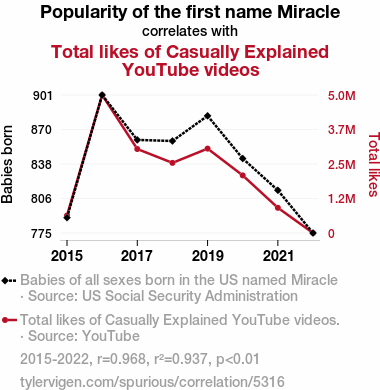 User prompt: Please make up a funny explanation for how increases in Popularity of the first name Miracle positively influenced Total likes of Casually Explained YouTube videos. Make it feel plausible.