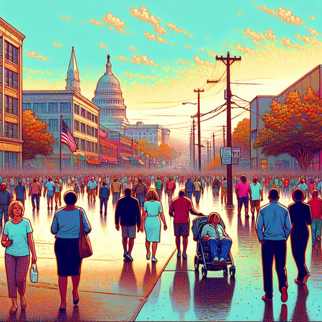 Prompt: Generate an image with the style of a meme, depicting a scene in Tuscaloosa, Alabama. Show a bustling city scene with vibrant colors and clear skies. Republican voters are confidently heading to the polls, exuding a sense of determination and purpose. The clean air and serene atmosphere should be evident, conveying a sense of ease and inspiration. The depiction should include only scenes, people, and objects, it should not include text or speech bubbles.