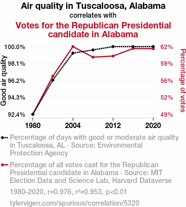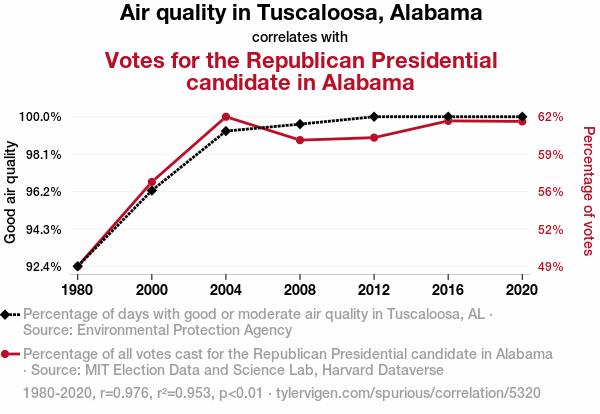 This means 95.3% of the change in the one variable (i.e., Votes for the Republican Presidential candidate in Alabama) is predictable based on the change in the other (i.e., Air quality in Tuscaloosa, Alabama) over the 7 years from 1980 through 2020.