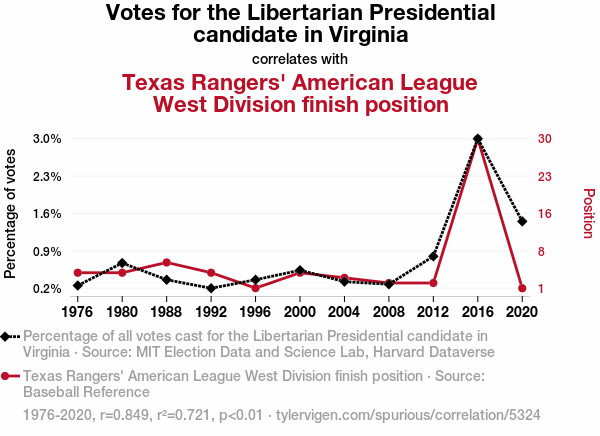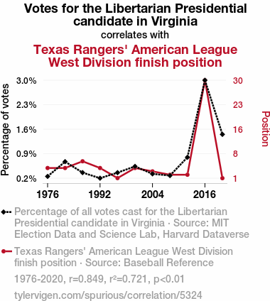 User prompt: Please provide potential search keywords for a paper titled Rounding the Bases: The Libertarian Leverage on the Texas Rangers' Divisional Destiny with an abstract of The connection between seemingly unrelated phenomena has long perplexed scholars and skeptics alike. In this study, we investigate the intriguing relationship between votes for the Libertarian presidential candidate in Virginia and the performance of the Texas Rangers in the American League West Division. Through rigorous data analysis using information from MIT Election Data and Science Lab, Harvard Dataverse, and Baseball Reference, we unearth a surprising correlation coefficient of 0.8492673 and p < 0.01 spanning the years 1976 to 2020.