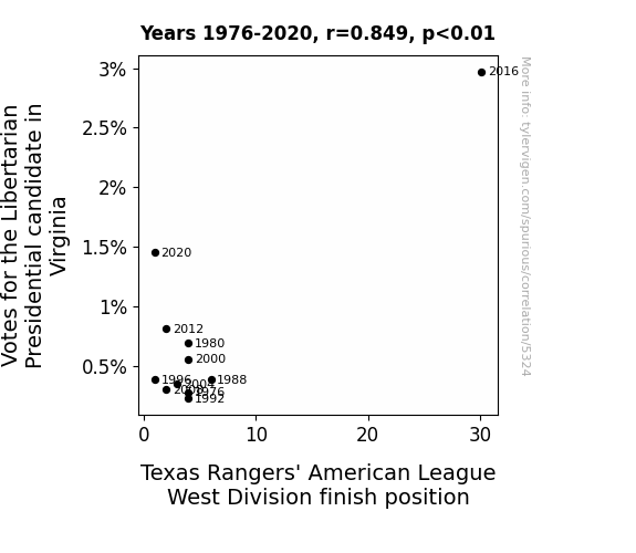 The connection between seemingly unrelated phenomena has long perplexed scholars and skeptics alike. In this study, we investigate the intriguing relationship between votes for the Libertarian presidential candidate in Virginia and the performance of the Texas Rangers in the American League West Division. Through rigorous data analysis using information from MIT Election Data and Science Lab, Harvard Dataverse, and Baseball Reference, we unearth a surprising correlation coefficient of 0.8492673 and p < 0.01 spanning the years 1976 to 2020.