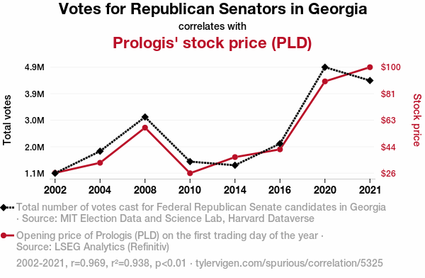 - The spurious research paper: Red State, Green Stocks: An Examination of the Relationship between Republican Votes for Senators in Georgia and Prologis' Stock Price (PLD)