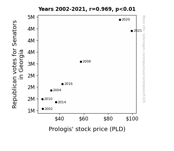 In conclusion, the findings of this study highlight an intriguing and unexpected relationship between political events and financial market dynamics. The remarkable correlation between Republican votes for Senators in Georgia and the stock price of Prologis (PLD) not only raises eyebrows, but also invites researchers to delve deeper into the complex interplay between politics and stock market performance. It appears that in the world of finance, even political preferences may have a surprising influence, leaving us to ponder: could it be that the "stock" market has a political leaning after all?