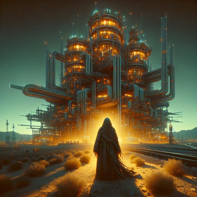 ChatGPT: Create an eerie image showing the juxtaposition of a stark futuristic concept and ancient tribal elements. In the foreground, a simmering biomass power plant looms ominously, its metallic structures casting long, creeping shadows over the desert landscape of Arizona. At the same time, nestled within the twisted metal framework, a forbidding figure stands, draped in traditional tribal attire. The scene is infused with an unsettling sense of contrast, as the figure's face is obscured in shadow, hinting at a deep, unknowable power emanating from the connection between ancient and modern energy influences.