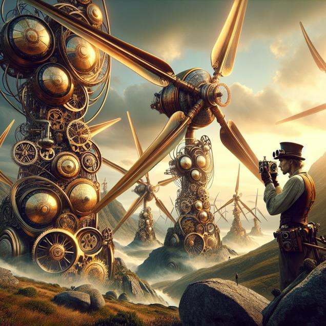 ChatGPT: Generate an image of a steampunk version of the sweeping Norwegian landscape, with giant wind turbines made of polished brass and copper, adorned with intricate gears and cogs. Mark Rober stands amidst this mechanical wonder, his camera a fusion of vintage and cutting-edge technology, capturing the motion of the turbines with mesmerizing energy. The atmosphere teems with an otherworldly fusion of nature and mechanical ingenuity, embodying the boundless potential of Norway's wind power in a visually stunning way.