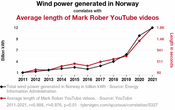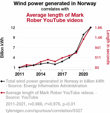 This means 97.6% of the change in the one variable (i.e., Average length of Mark Rober YouTube videos) is predictable based on the change in the other (i.e., Wind power generated in Norway) over the 11 years from 2011 through 2021.